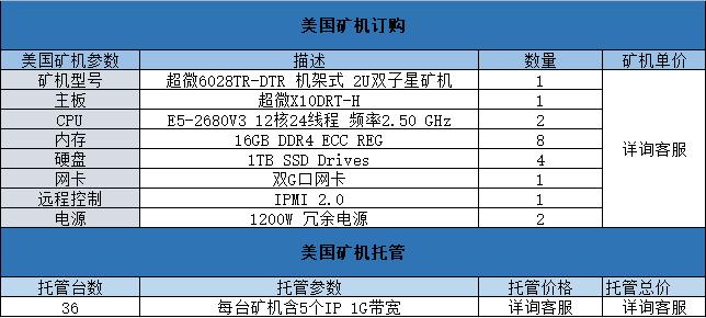 1、美國(guó)礦機(jī)訂購(gòu) 36 節(jié)點(diǎn)起,美國(guó)交付,18 臺(tái)雙子星礦機(jī),含 36 臺(tái)礦機(jī);