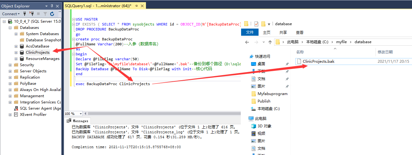 USE MASTER IF EXISTS ( SELECT * FROM sysobjects WHERE id = OBJECT_ID(N'[BackupDataProc]') AND OBJECTPROPERTY(id, N'IsProcedure') = 1 ) DROP PROCEDURE BackupDataProc go create proc BackupDataProc @FullName Varchar(200)--入?yún)ⅲ〝?shù)據(jù)庫名) as begin Declare @FileFlag varchar(50) Set @FileFlag='C:\myfile\database\'+@FullName+'.bak'--備份到哪個路徑(C:\myfile\database\)根據(jù)自己需求來定 BackUp DataBase @FullName To Disk=@FileFlag with init--核心代碼 end exec BackupDataProc xxx