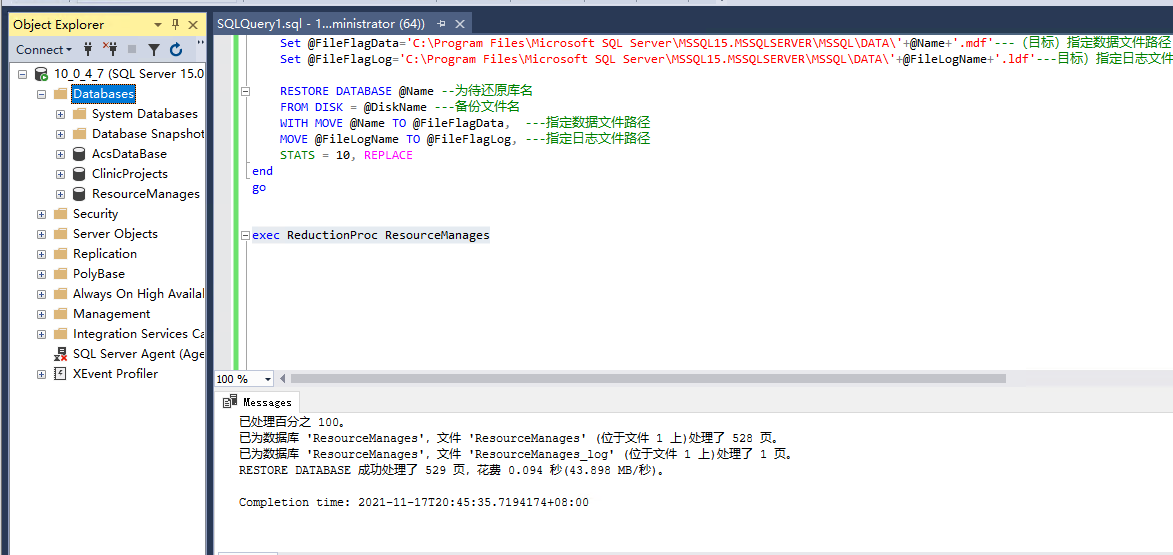 IF EXISTS ( SELECT * FROM sysobjects WHERE id = OBJECT_ID(N'[ReductionProc]') AND OBJECTPROPERTY(id, N'IsProcedure') = 1 ) DROP PROCEDURE ReductionProc go create proc ReductionProc @Name nvarchar(200)--入?yún)?數(shù)據(jù)庫名稱 as begin Declare @DiskName nvarchar(500) Declare @FileLogName nvarchar(100) Declare @FileFlagData nvarchar(500) Declare @FileFlagLog nvarchar(500) Set @FileLogName = @Name + '_log' Set @DiskName = 'C:\myfile\database\'+@Name+'.bak' ---(源)備份文件路徑 Set @FileFlagData='C:\Program Files\Microsoft SQL Server\MSSQL15.MSSQLSERVER\MSSQL\DATA\'+@Name+'.mdf'---(目標(biāo))指定數(shù)據(jù)文件路徑 Set @FileFlagLog='C:\Program Files\Microsoft SQL Server\MSSQL15.MSSQLSERVER\MSSQL\DATA\'+@FileLogName+'.ldf'---目標(biāo))指定日志文件路徑 RESTORE DATABASE @Name --為待還原庫名 FROM DISK = @DiskName ---備份文件名 WITH MOVE @Name TO @FileFlagData, ---指定數(shù)據(jù)文件路徑 MOVE @FileLogName TO @FileFlagLog, ---指定日志文件路徑 STATS = 10, REPLACE end go exec ReductionProc xxx