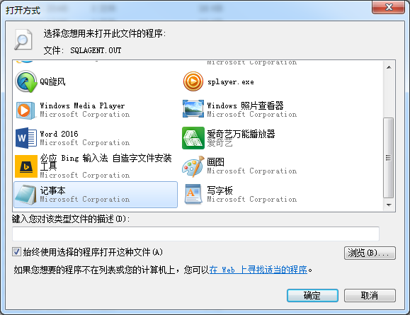 一旦你在\MSSQL\LOG目錄里,對(duì)于SQL Server和SQL Server代理,你都會(huì)看到很多日志文件,原先的日志文件(只要正常啟動(dòng)服務(wù),每次都會(huì)創(chuàng)建)也在目錄里。SQLAGENT.OUT文件是SQL Server代理的當(dāng)前日志文件,因此這是你要打開(kāi)的文件。默認(rèn)情況下,當(dāng)你嘗試打開(kāi)這個(gè)文件時(shí),你需要選擇打開(kāi)這個(gè)后綴為.OUT文件的默認(rèn)程序。記事本就可以,當(dāng)你有另一個(gè)喜好,你可以選擇這個(gè)擴(kuò)展文件名的文本查看器(如圖2所示,選擇記事本)。