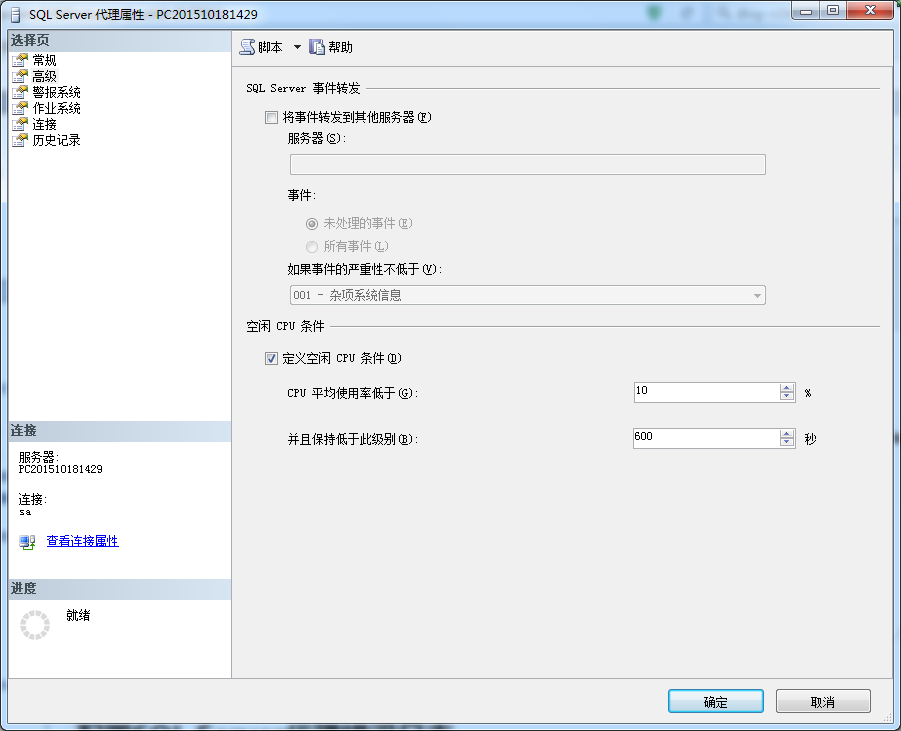 這條警告表明一個(gè)SQL Server代理設(shè)置沒(méi)有配置,可能阻止某些作業(yè)運(yùn)行。你可以設(shè)置作業(yè)在CPU“空閑”時(shí)運(yùn)行(在第一篇提到過(guò))。然而,在這個(gè)系統(tǒng)中空閑的定義還沒(méi)有被 設(shè)置。在SSMS配置此選項(xiàng),右擊SQL Server代理,選擇屬性,然后單擊高級(jí)選項(xiàng)卡。配置空閑CPU條件如插圖7所示