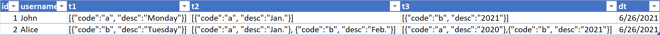 values ('John' , '[{"code":"a", "desc":"Monday"}]', '[{"code":"a", "desc":"Jan."}]', '[{"code":"b", "desc":"2021"}]' ,getdate())