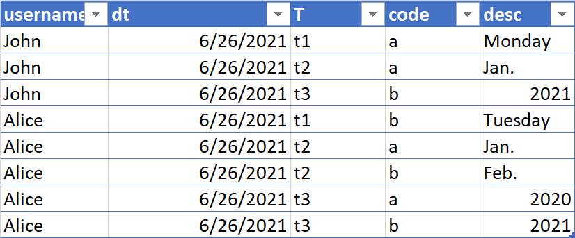 | 1 | user1 | 2021-6-26 | Q1 | A | Jan. |