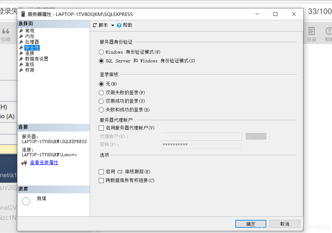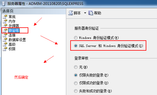 6、安全性——選中 SQL Server 和 Windows 身份驗(yàn)證模式——確定
