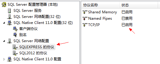 在這里我們要將SQLEXPRESS和SQL2012兩個(gè)協(xié)議中的TCP/IP協(xié)議都開啟。