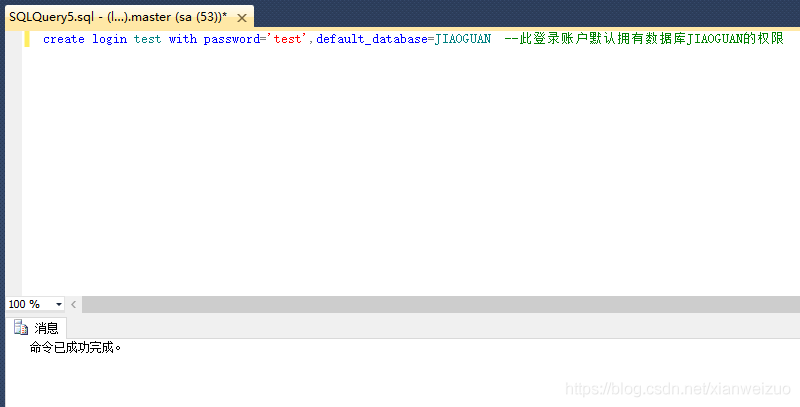 create login test with password='test',default_database=JIAOGUAN --此登錄賬戶默認(rèn)擁有數(shù)據(jù)庫(kù)JIAOGUAN的權(quán)限