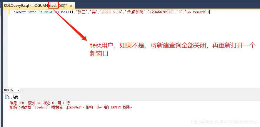 第三步:拒絕test用戶對(duì)Student表執(zhí)行insert語(yǔ)句