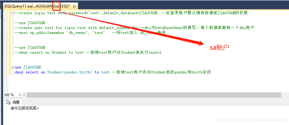 use JIAOGUAN create user test for login test with default_schema=dbo --dbo為DataBaseOwner的簡(jiǎn)寫(xiě),每個(gè)數(shù)據(jù)庫(kù)都有一個(gè)dbo用戶 exec sp_addrolemember 'db_owner', 'test' --將test加入 db_owner角色