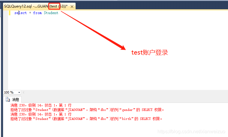 使用test賬戶登錄之后,嘗試使用select * from Student,將提示錯(cuò)誤