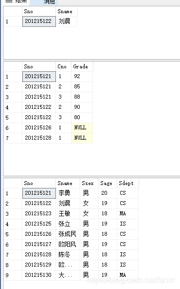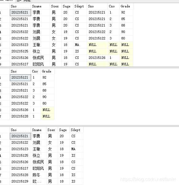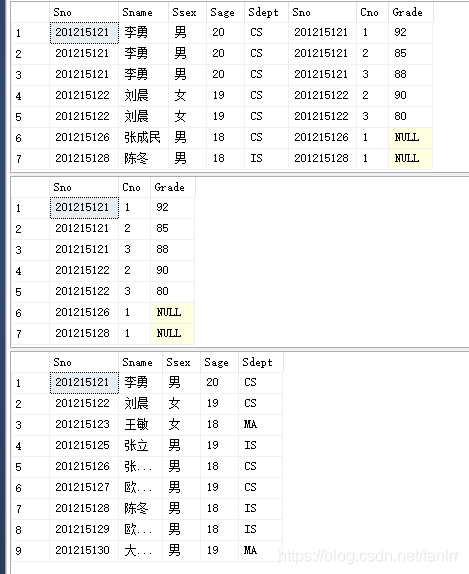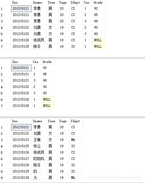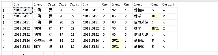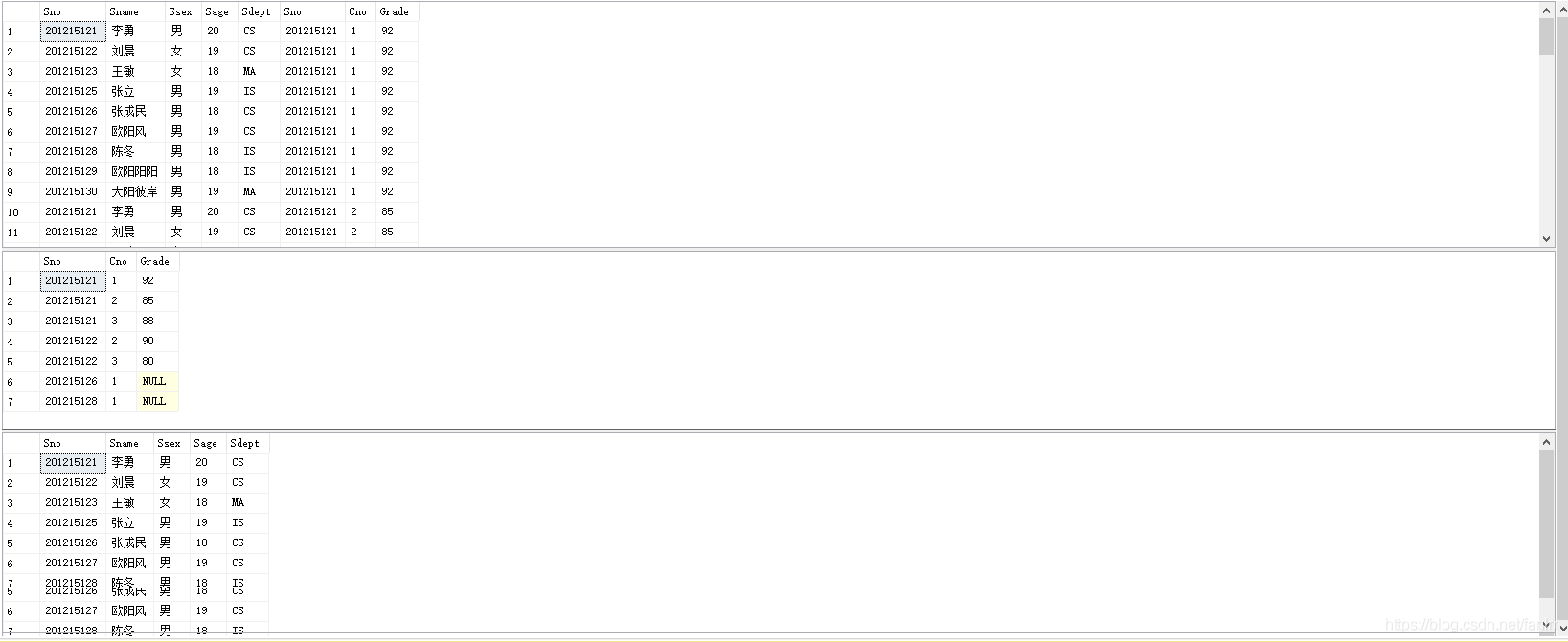 SELECT Student.Sno,Sname,Ssex,Sage,Sdept,Cno,Grade FROM Student,SC WHERE Student.Sno=SC.Sno; SELECT * FROM SC; SELECT * FROM Student;