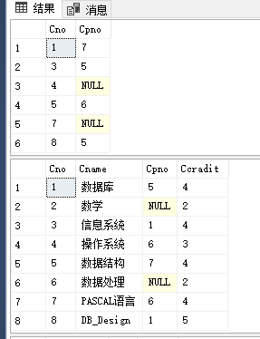 SELECT FIRST.Cno,SECOND.Cpno FROM Course FIRST,Course SECOND WHERE FIRST.Cpno=SECOND.Cno; SELECT * FROM Course;