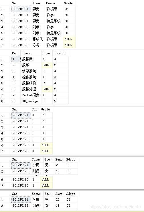 SELECT Student.Sno,Sname,Cname,Grade FROM Student,SC,Course WHERE Student.Sno=SC.Sno AND SC.Cno=Course.Cno; SELECT * FROM Course; SELECT * FROM SC; SELECT * FROM Student;
