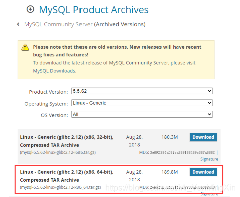 [root@bogon tmp]# tar -zxvf mysql-5.5.62-linux-glibc2.12-x86_64.tar.gz [root@bogon tmp]# ll drwxr-xr-x. 13 root root 213 11月 6 12:41 mysql-5.5.62-linux-glibc2.12-x86_64 -rw-r--r--. 1 root root 198993245 11月 6 12:35 mysql-5.5.62-linux-glibc2.12-x86_64.tar.gz