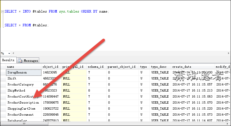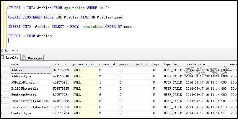 SELECT * INTO #tables FROM sys.tables ORDER BY name; SELECT * FROM #tables;
