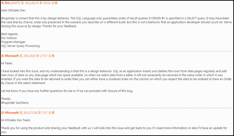 如上所示,SQL SERVER 2014則是無(wú)序狀態(tài),我很是奇怪怎么從SQL SERVER 2012就開(kāi)始變成無(wú)序了,這對(duì)我們來(lái)說(shuō)猶如一個(gè)黑盒子,只知道結(jié)果集出現(xiàn)了變化,但是不知道內(nèi)部啥變化導(dǎo)致這個(gè)現(xiàn)象出現(xiàn)。Records not sorted in the table when using ORDER BY clause to insert data into Temp Table 官方論壇對(duì)這個(gè)問(wèn)題的描述如下: