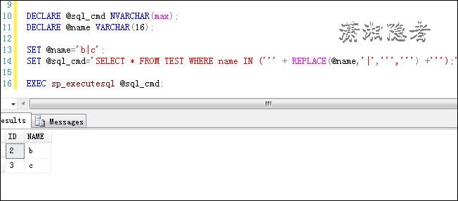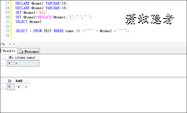 DECLARE @name VARCHAR(16); SET @name='a'; SELECT * FROM TEST WHERE name IN (@name); GO DECLARE @name VARCHAR(16); SET @name='a,b'; SELECT * FROM TEST WHERE name IN (@name); GO