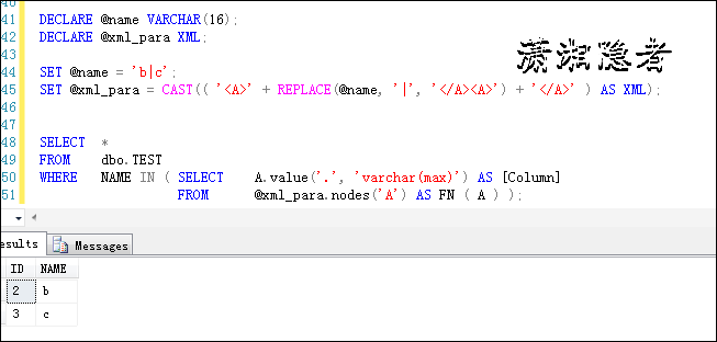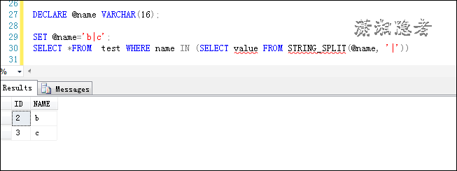 DECLARE @name VARCHAR(16); SET @name='b|c'; SELECT *FROM test WHERE name IN (SELECT value FROM STRING_SPLIT(@name, '|'))