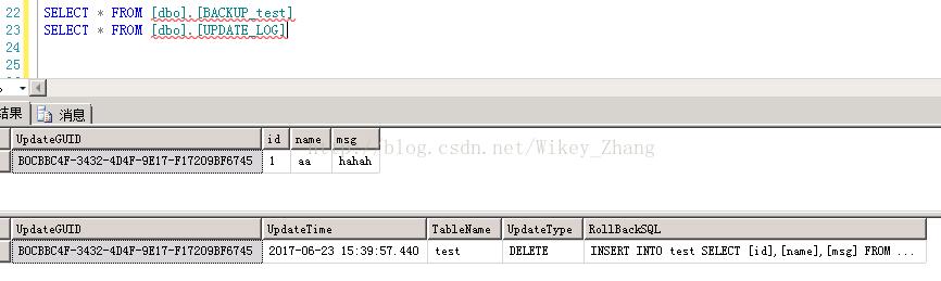 沒(méi)錯(cuò),這時(shí)候日志表里有數(shù)據(jù)了,然后我們把 UPDATE_LOG 表中的 RollBackSQ L這一列對(duì)應(yīng)的值copy出來(lái)執(zhí)行一下: