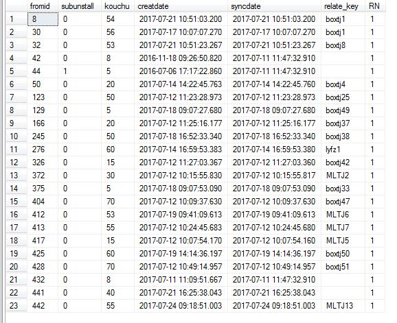 WHERE RN= 1;取第一條數(shù)據(jù) SELECT * FROM (SELECT fromid,subunstall,kouchu,creatdate,syncdate,relate_key,ROW_NUMBER() OVER( PARTITION BY fromid ORDER BY creatdate DESC)RN FROM BoxCount_Froms_Open ) T WHERE RN= 1;