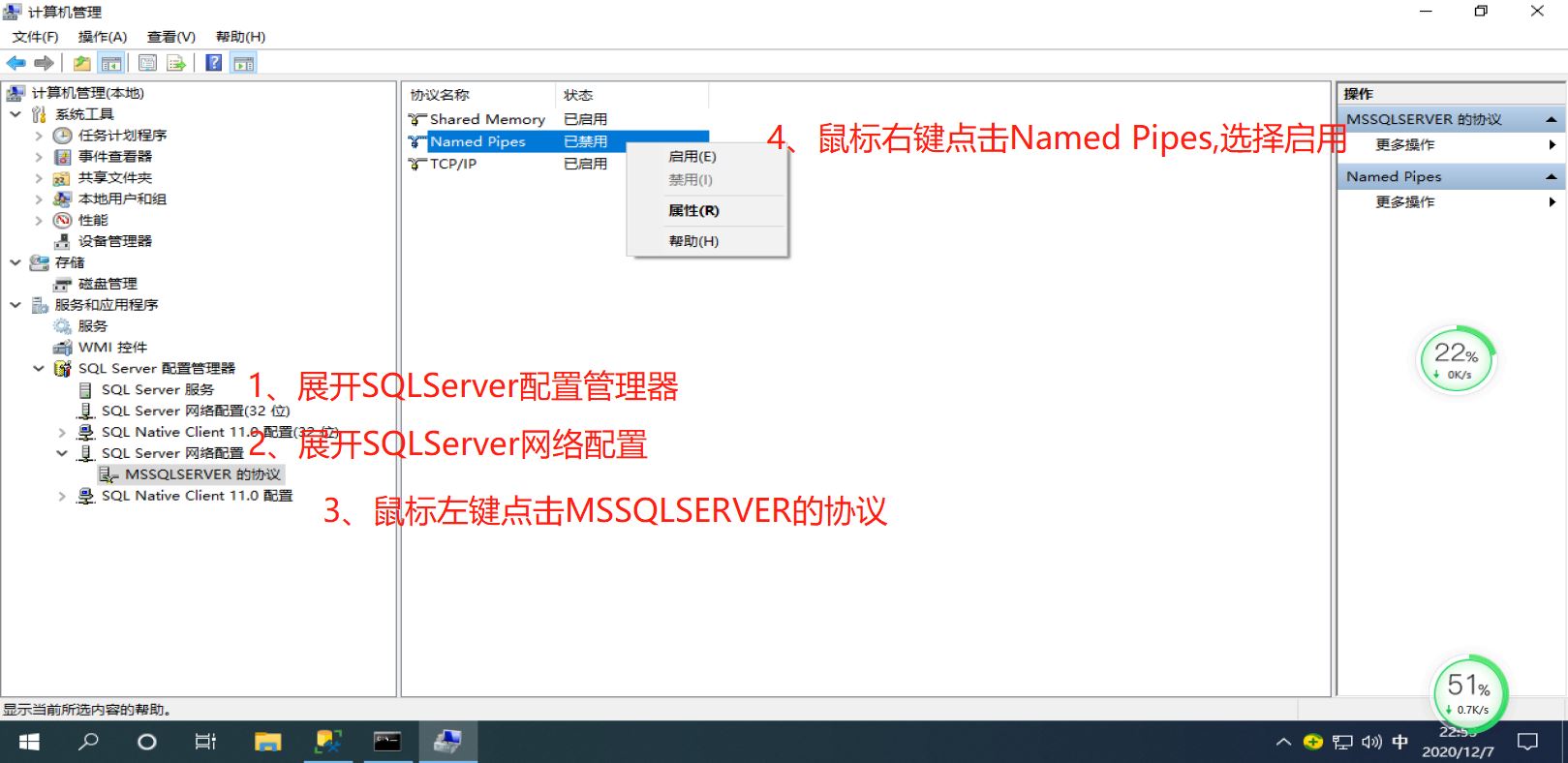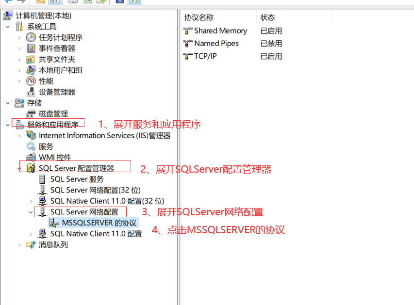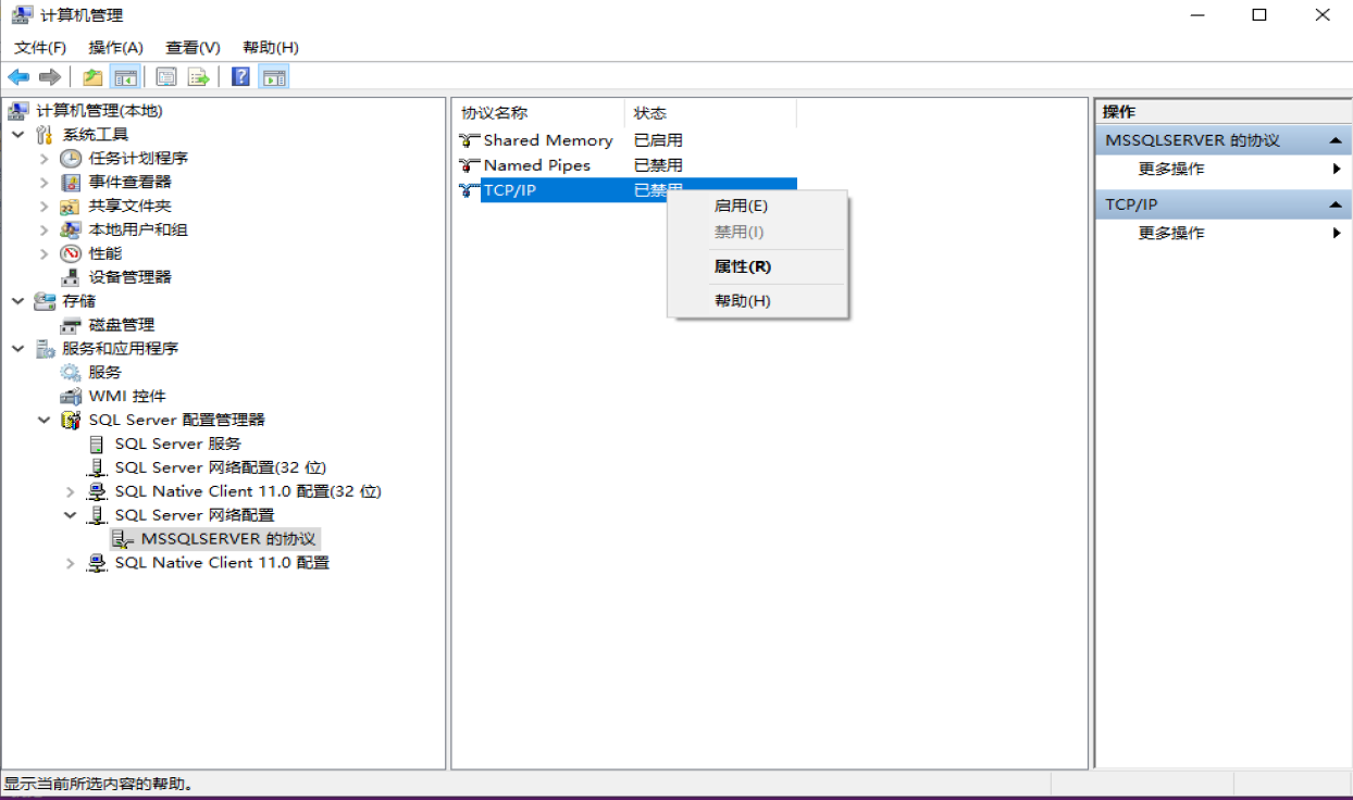 1、在計(jì)算機(jī)管理-》展開(kāi)SQLServer配置管理器-》展開(kāi)SQLServer網(wǎng)絡(luò)配置-》鼠標(biāo)左鍵點(diǎn)擊MSSQLSERVER的協(xié)議-》選擇Named Pipes-》右鍵點(diǎn)擊-》點(diǎn)擊啟用。