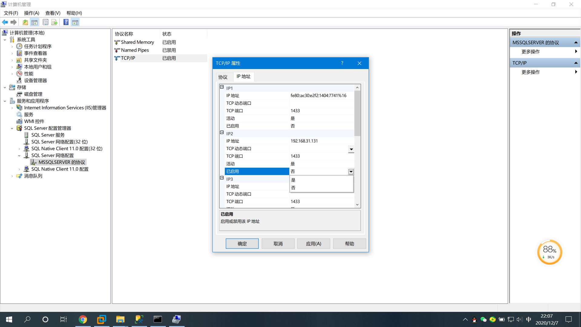 5、右鍵點(diǎn)擊TCP/IP-》點(diǎn)擊啟用-》點(diǎn)擊彈出框中的確定。