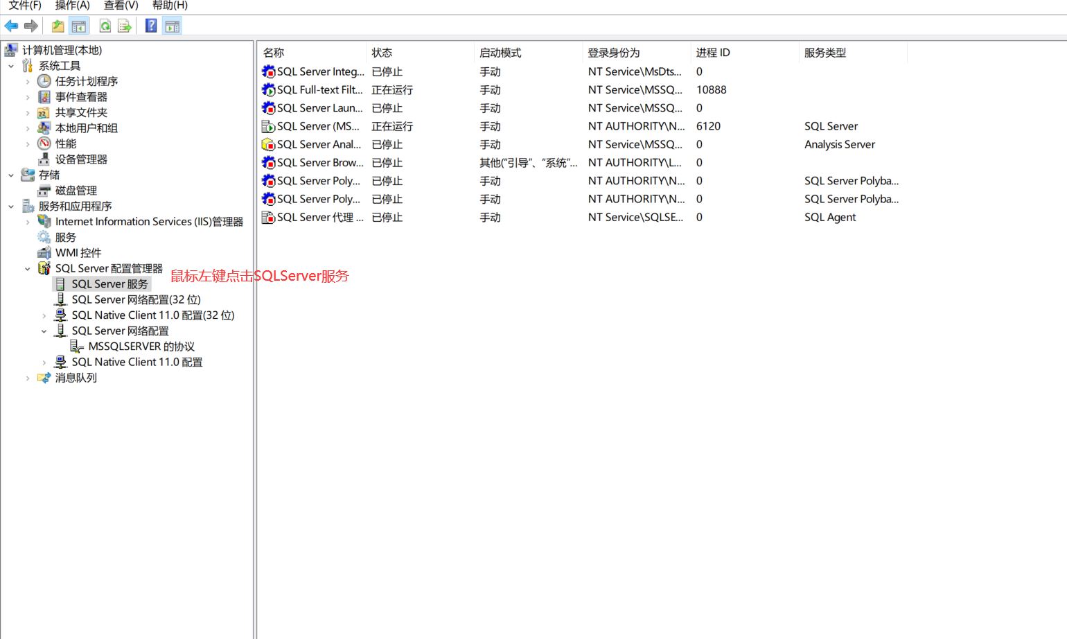 7、在計(jì)算機(jī)管理頁(yè)面-》鼠標(biāo)左鍵點(diǎn)擊SQLServer服務(wù)。