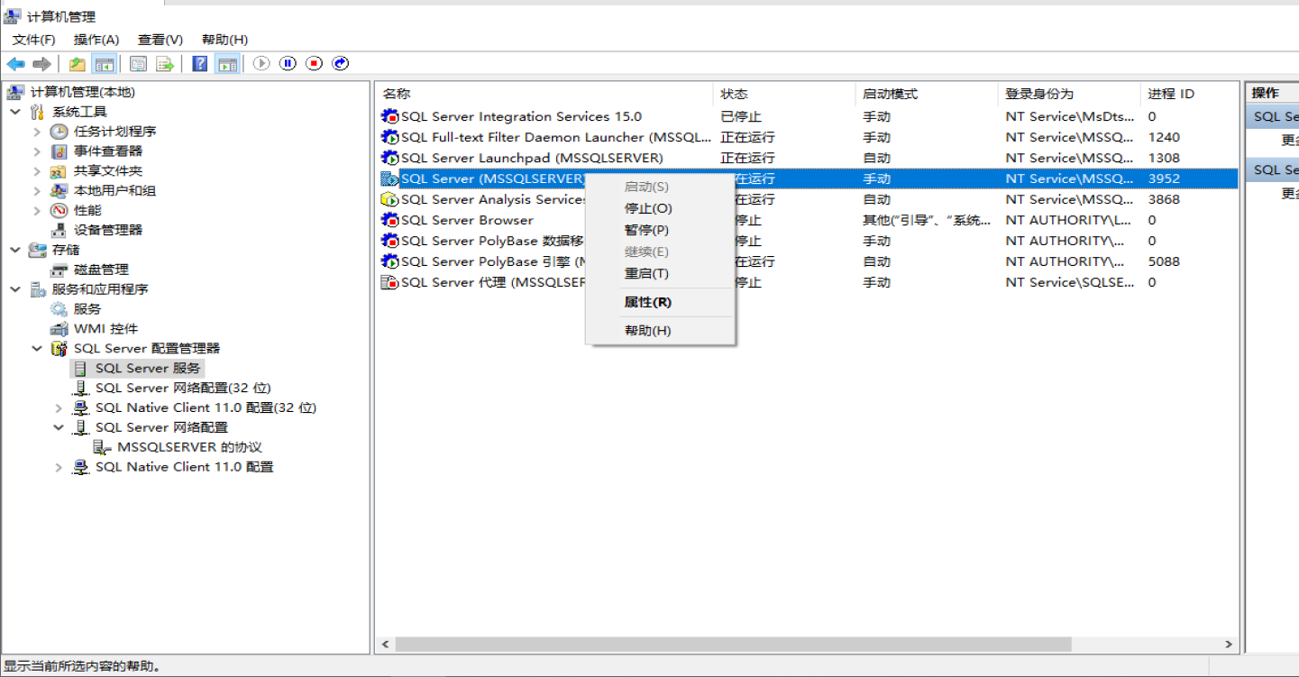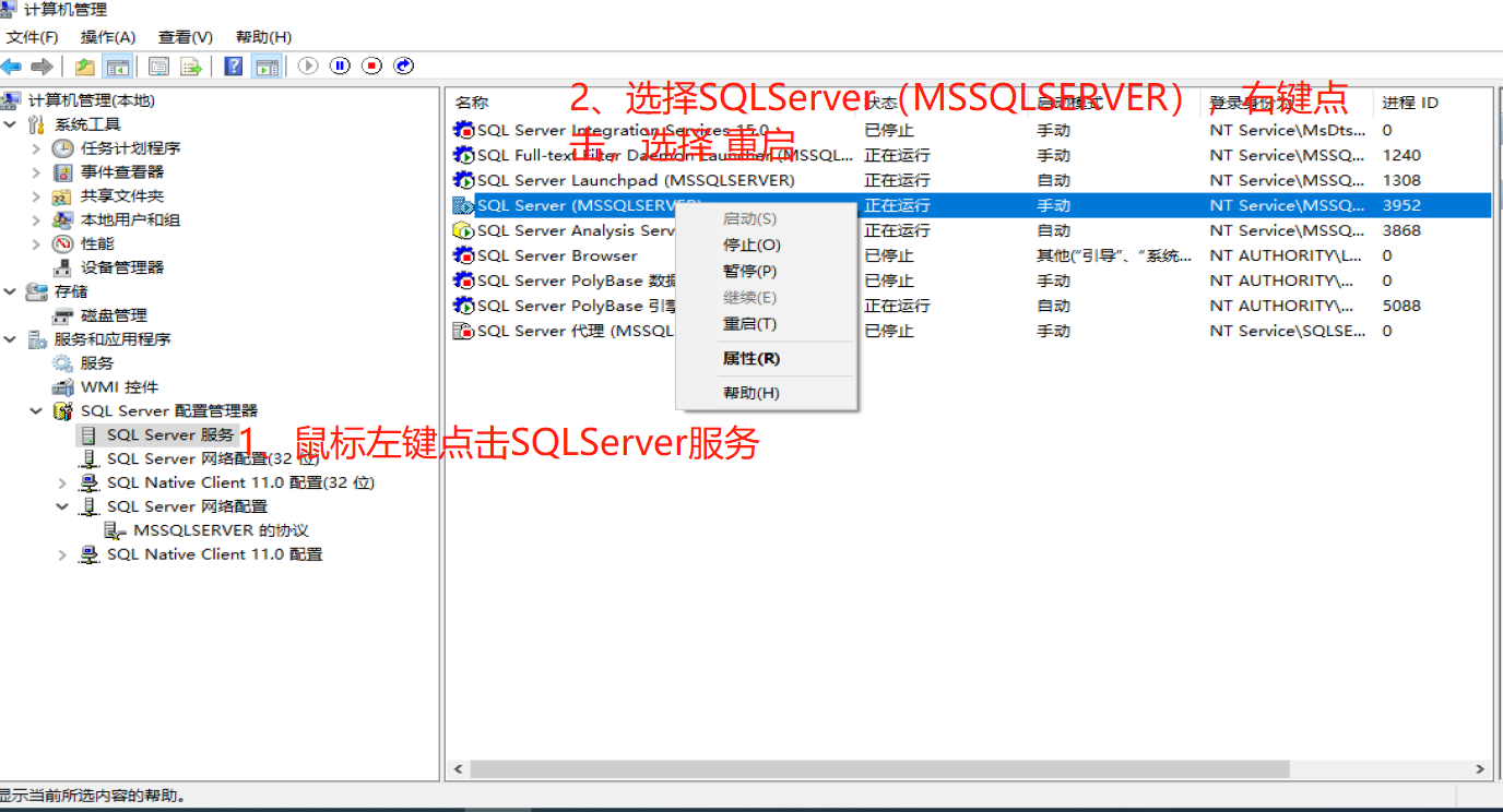 8、找到SQLServer(MSSQLSERVER)服務(wù)-》右鍵點(diǎn)擊-》選擇重啟-》等待重啟完成。