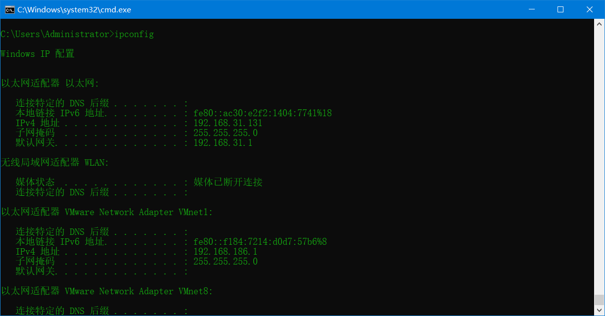 9、在dos命令窗口中輸入ipconfig命令查看本機(jī)ip。