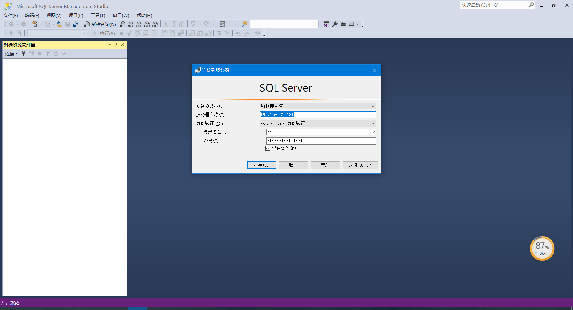 10、打開(kāi)SSMS數(shù)據(jù)庫(kù)管理工具-》在服務(wù)器名稱中輸入IP地址-》身份驗(yàn)證選擇SQLServer身份驗(yàn)證-》輸入登錄名和密碼-》點(diǎn)擊連接。