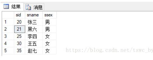 insert into student5(sid,sname,ssex) values (21,'黑六','男');