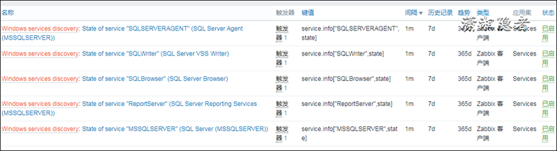 此時就會在應(yīng)用集“Template Module Windows services by Zabbix agent: Services”中看到對應(yīng)的SQL Server相關(guān)服務(wù)的觸發(fā)器