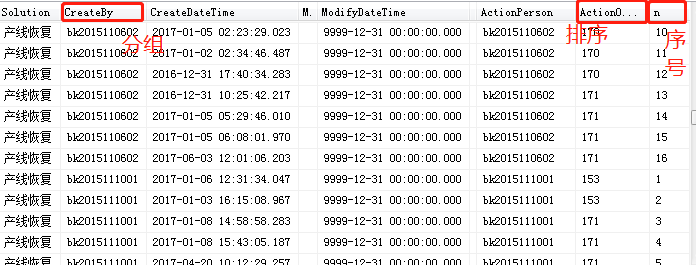 select *,row_number() over(partition by createby order by actionOpeid) as n from [dbo].[Basal_Anormal_Solution]