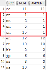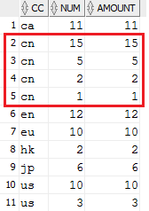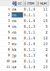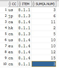 11條記錄經(jīng)group by后為10條,其中cc='cn' and item='8.1.1'對(duì)應(yīng)的兩條記錄的num匯總成值3.