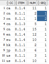 select a.*, row_number() over (partition by a.cc,a.item order by a.num desc) as seq from table_temp a