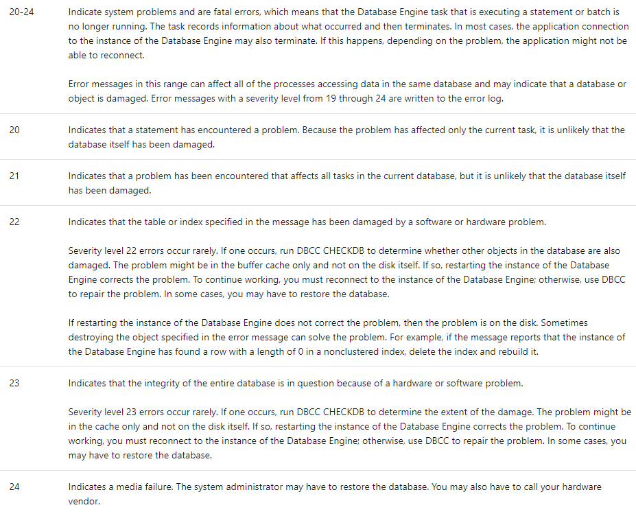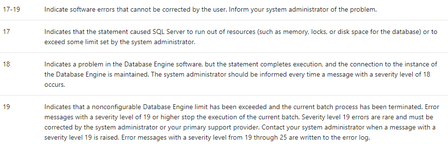 錯(cuò)誤的嚴(yán)重程序(Severity Level)共有24個(gè)級(jí)別,表明SQL Sever遇到問題的類型,Severity Level是一個(gè)int類型,可以由函數(shù)ERROR_SEVERITY() 返回,數(shù)值越大,說明問題越嚴(yán)重。