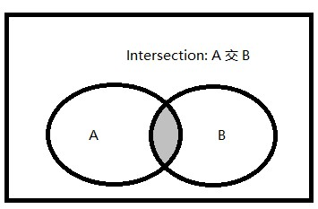 交集:兩個(gè)集合(記為集合A和集合B)的交集是由既屬于A,也屬于B的所有元素組成的集合。