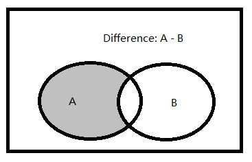 差集:兩個(gè)集合(記為集合A和集合B)的由屬于集合A,但不屬于集合B的所有元素組成的集合。
