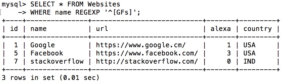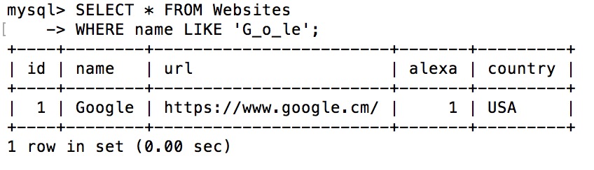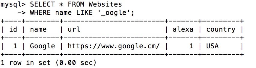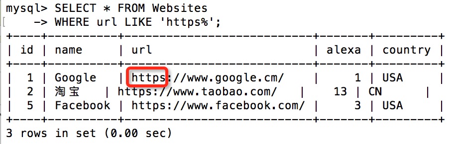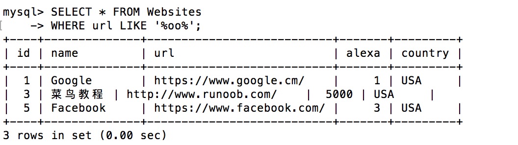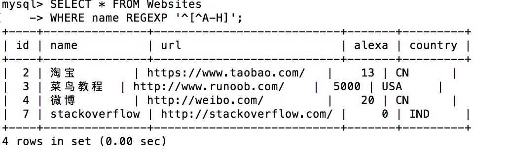 | id | name | url | alexa | country | +----+--------------+---------------------------+-------+---------+ | 1 | Google | https://www.google.cm/ | 1 | USA | | 2 | 淘寶 | https://www.taobao.com/ | 13 | CN | | 3 | 菜鳥教程 | http://www.runoob.com/ | 4689 | CN | | 4 | 微博 | http://weibo.com/ | 20 | CN | | 5 | Facebook | https://www.facebook.com/ | 3 | USA | | 7 | stackoverflow | http://stackoverflow.com/ | 0 | IND | +----+---------------+---------------------------+-------+---------+