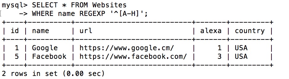 MySQL 中使用 REGEXP 或 NOT REGEXP 運算符 (或 RLIKE 和 NOT RLIKE) 來操作正則表達式。