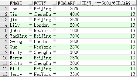 select fname, fcity, fsalary, count(*) over() 工資小于5000員工數(shù) from t_person where fsalary < 5000
