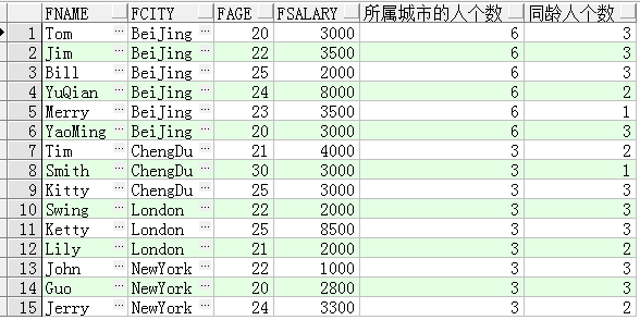 select fname,fcity,fage,fsalary,count(*) over(partition by fcity) 所在城市人數(shù) from t_person