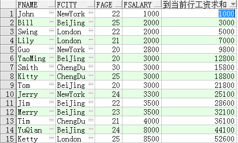 select fname, fcity, fage, fsalary, sum(fsalary) over(order by fsalary rows between unbounded preceding and current row) 到當前行工資求和 from t_person