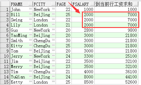 select fname, fcity, fage, fsalary, sum(fsalary) over(order by fsalary) 到當前行工資求和 from t_person