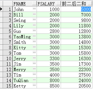 SELECT FName, FSalary, SUM(FSalary) OVER(ORDER BY FSalary ROWS BETWEEN 2 PRECEDING AND 2 FOLLOWING) 前二后二和 FROM T_Person;