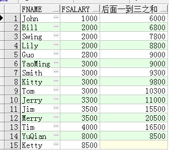 SELECT FName, FSalary, SUM(FSalary) OVER(ORDER BY FSalary ROWS BETWEEN 1 FOLLOWING AND 3 FOLLOWING) 后面一到三之和 FROM T_Person;