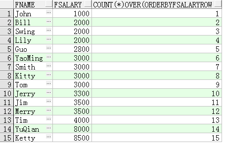 SELECT FName, FSalary, COUNT(*) OVER(ORDER BY FSalary ROWS BETWEEN UNBOUNDED PRECEDING AND CURRENT ROW) FROM T_Person;
