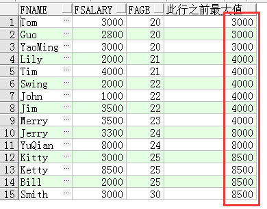 SELECT FName, FSalary,FAge, MAX(FSalary) OVER(ORDER BY FAge) 此行之前最大值 FROM T_Person;