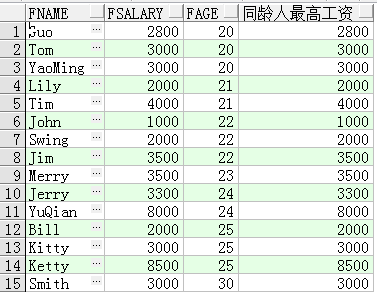 SELECT FName, FSalary,FAge, MAX(FSalary) OVER(PARTITION BY FAge order by fsalary) 同齡人最高工資 FROM T_Person;