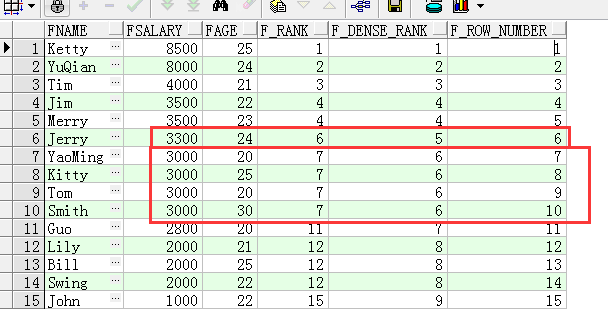 SELECT FName, FSalary,FAge, RANK() OVER(ORDER BY fsalary desc) f_RANK, DENSE_RANK() OVER(ORDER BY fsalary desc) f_DENSE_RANK, ROW_NUMBER() OVER(ORDER BY fsalary desc) f_ROW_NUMBER FROM T_Person;