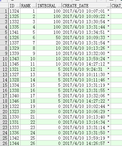 比如要查詢期號issue為20170410期的排行榜,按得分倒敘排序,得分一樣按訂單創(chuàng)建先后,算排行,sql需要這么寫: